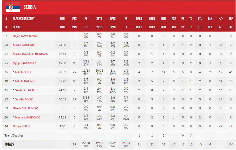 Κορυφαίος ο Νίκολα Γιόκιτς με 29 πόντους (10/12διπ., 1/1τρ., 6/6β.), 11 ριμπάουντ, 5 ασίστ, 4 κλεψίματα, ακολούθησε ο Βασίλιε Μίσιτς με 19 πόντους.