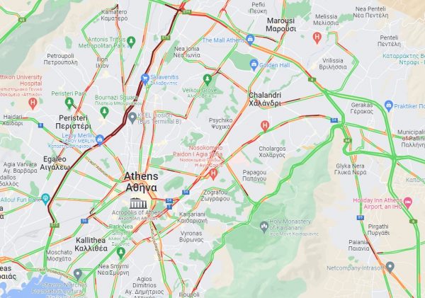 Μετ’ εμποδίων διεξάγεται η κίνηση των οχημάτων και στην άνοδο της Κηφίσιας, καθώς και στην κάθοδο της Μεσογείων.