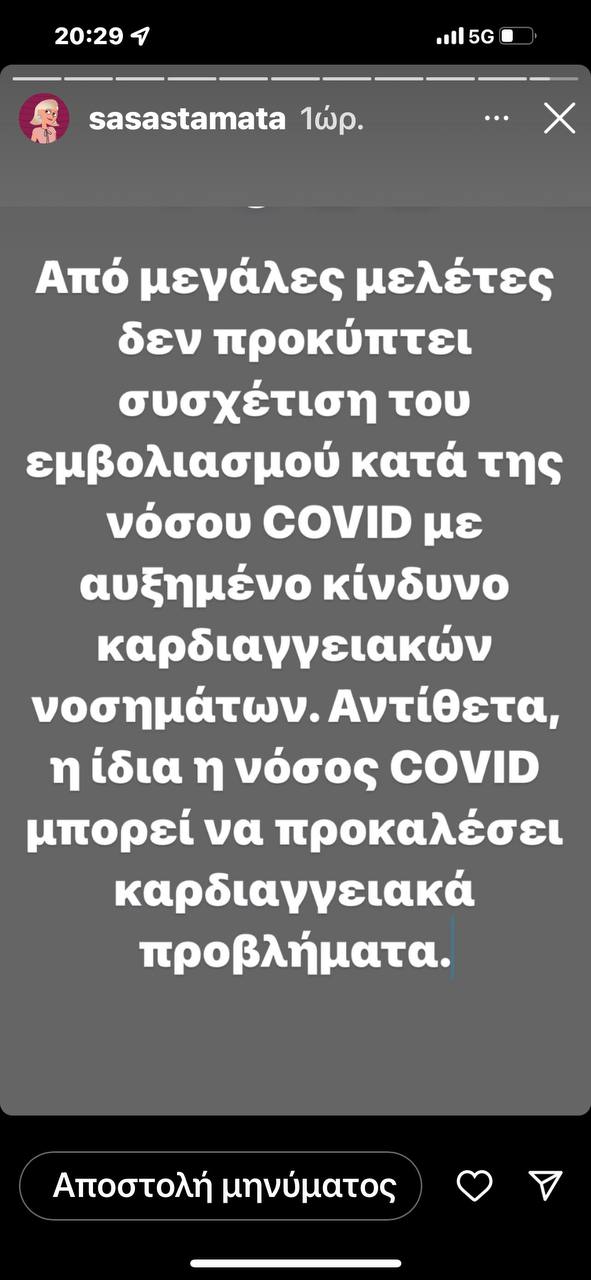 Με τρόπο κομψό και κυρίως τεκμηριωμένο η Σάσα Σταμάτη απαντά σε όσους προσπαθούν να παρουσιάσουν το πρόβλημα υγείας που αντιμετώπισε πρόσφατα με παρενέργειες του εμβολίου για τον κοροναϊό, προς επίρρωση των όσων ανυπόστατων -συχνά δε στα όρια του εξωφρενικού- υποστηρίζουν.