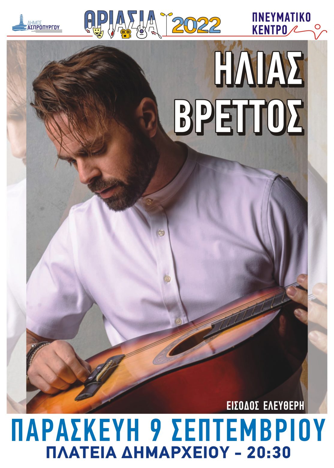 Με τη συναυλία του Ηλία Βρεττού ανοίγει η αυλαία του Πολιτιστικού Φεστιβάλ Ασπροπύργου «ΘΡΙΑΣΙΑ 2022», την Παρασκευή 9 Σεπτεμβρίου 2022 στις 20:30 στην Πλατεία Δημαρχείου. Ο αγαπημένος καλλιτέχνης με τα 5 albums, τα πολλά singles, θα εμφανιστεί στο πλαίσιο της καλοκαιρινής του περιοδείας, με τίτλο «Ως το άπειρο».