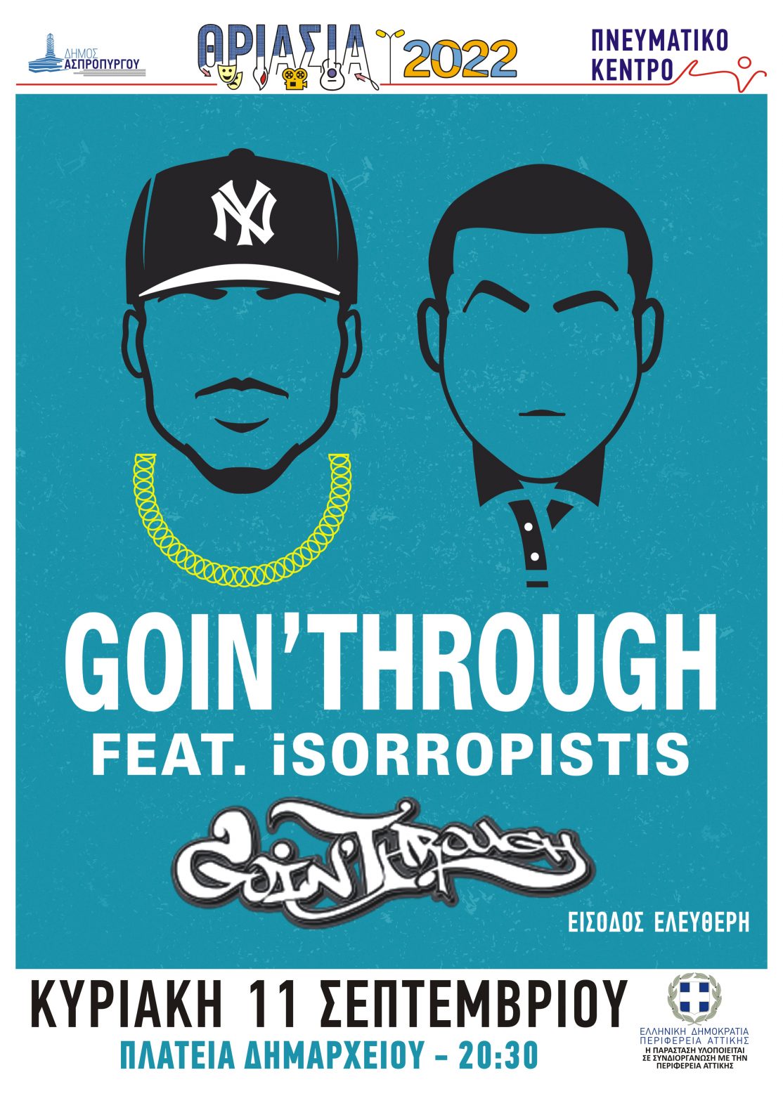 Ενώ την Κυριακή 11 Σεπτεμβρίου 2022 στις 20:30 στην Πλατεία Δημαρχείου θα δώσει συναυλία το συγκρότημα Goin’ Through, του Νίκου Βουρλιώτη και του Μιχάλη Παπαθανασίου, παρέα με τον «Ισορροπιστή» Συνδιοργάνωση με την Περιφέρειας Αττικής.