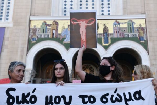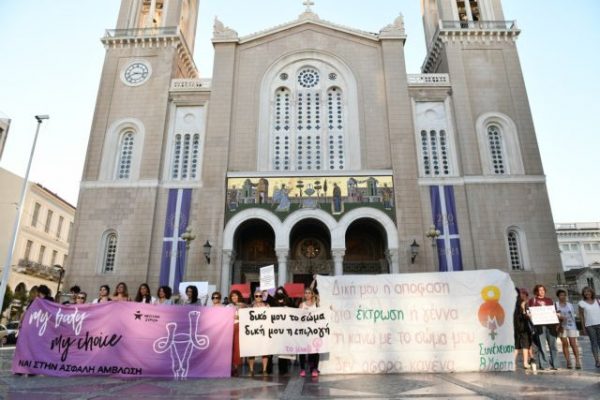 Με συνθήματα «δική μου το σώμα, δική μου επιλογή» και «βάλτε τέλος στον Μεσαίωνα της εκκλησίας» πραγματοποιείται από το πρωί της Πέμπτης διαμαρτυρία έξω από τη Μητρόπολη Αθηνών για την εγκύκλιο κατά των αμβλώσεων που διαβάζεται σήμερα στις εκκλησίες όλης της χώρας.