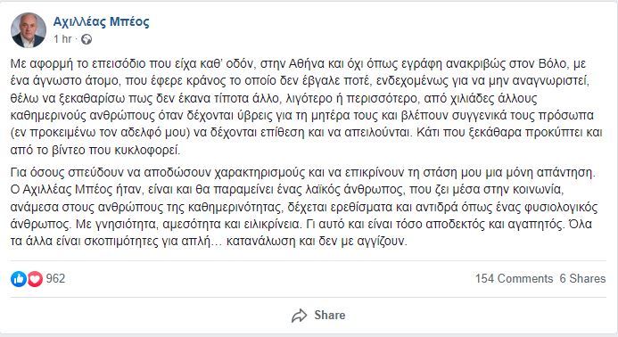 Διεισδύοντας λοιπόν στο μυαλό και τη σκέψη του Αχιλλέα Μπέου, που όπως έχει αποδειχθεί δεν έχει και κάνενα απροσμέτρητο βάθος, τα νταηλίκια μέσα στη μέση του δρόμου αποκαλύπτουν ακριβώς ότι είναι ένας «λαϊκός άνθρωπος», που «αντιδρά με γνησιότητα, αμεσότητα και ειλικρίνεια» όπως γράφει σε ανάρτησή του, σβήνοντας από τις σελίδες της λαϊκής ιστορίας όλη την εποχή του Διαφωτισμού.