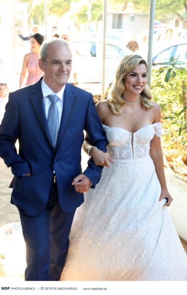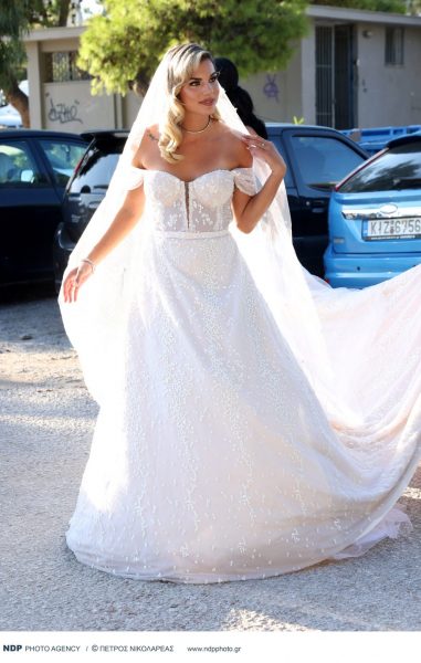 Η νύφη επέλεξε ένα νυφικό με κεντημένο μπούστο και μανίκια που έπεφταν χαλαρά στους ώμους και μια ανθοδέσμη με λευκά και λιλά λουλούδια.