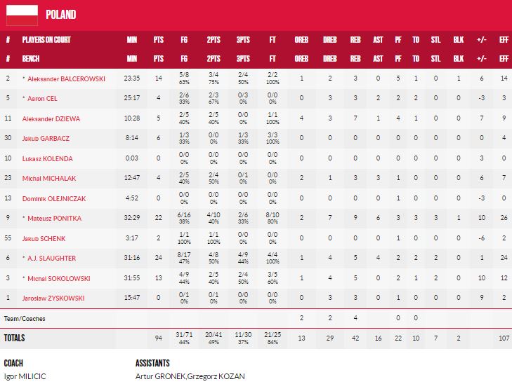 Σημείο-κλειδί της πολωνικής επικράτησης όταν στο 76-76 (33′) ο Πονίτκα βγήκε μπροστά, πέτυχε 5 σερί πόντους και έδωσε την ασίστ στο τρίποντο του Σοκολόφσκι για το 84-78. Η Ουκρανία το έκανε ντέρμπι, μείωσε σε 87-84, με δύο βολές του Μίχαλιουκ έκανε το 86-88, αλλά ο Σλότερ με δύο βολές έκανε το 86-90 στα 30 δευτερόλεπτα και κάπου εκεί έληξαν όλα. Τελικό αποτέλεσμα 86-94 και πρόκριση για πρώτη φορά μετά από 15 χρόνια στους «8» για την Πολωνία.