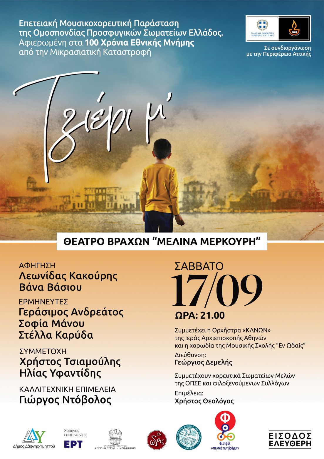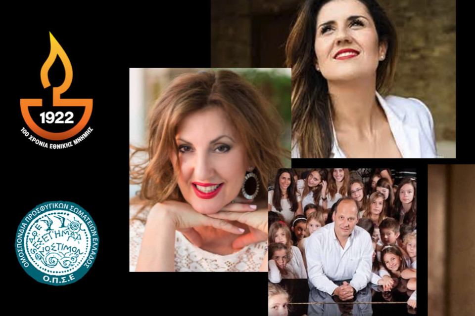 Η Ομοσπονδία Προσφυγικών σωματείων Ελλάδος (ΟΠΣΕ) τιμώντας τον απανταχού προσφυγικό Ελληνισμό πραγματοποιεί, με αφορμή τη συμπλήρωση 100 χρόνων από την Μικρασιατική Καταστροφή και τις εκδηλώσεις Μνήμης της 14ης Σεπτέμβρη για τη Γενοκτονία των Ελλήνων της Μικράς Ασίας, μία μοναδική συναυλία , στο Θέατρο Βράχων Μελίνα Μερκούρη, με ελεύθερη είσοδο.