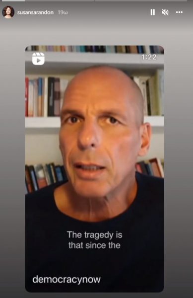 Αυτή τη φορά, η Σούζαν Σαράντον, μέσα από τον λογαριασμό της στο Instagram – τον οποίο χειρίζεται η ίδια – αναδημοσίευσε στις ιστορίες της (stories) ένα απόσπασμα δηλώσεων του Γιάνη Βαρουφάκη για την ενεργειακή κρίση που ταλανίζει την Ευρώπη.