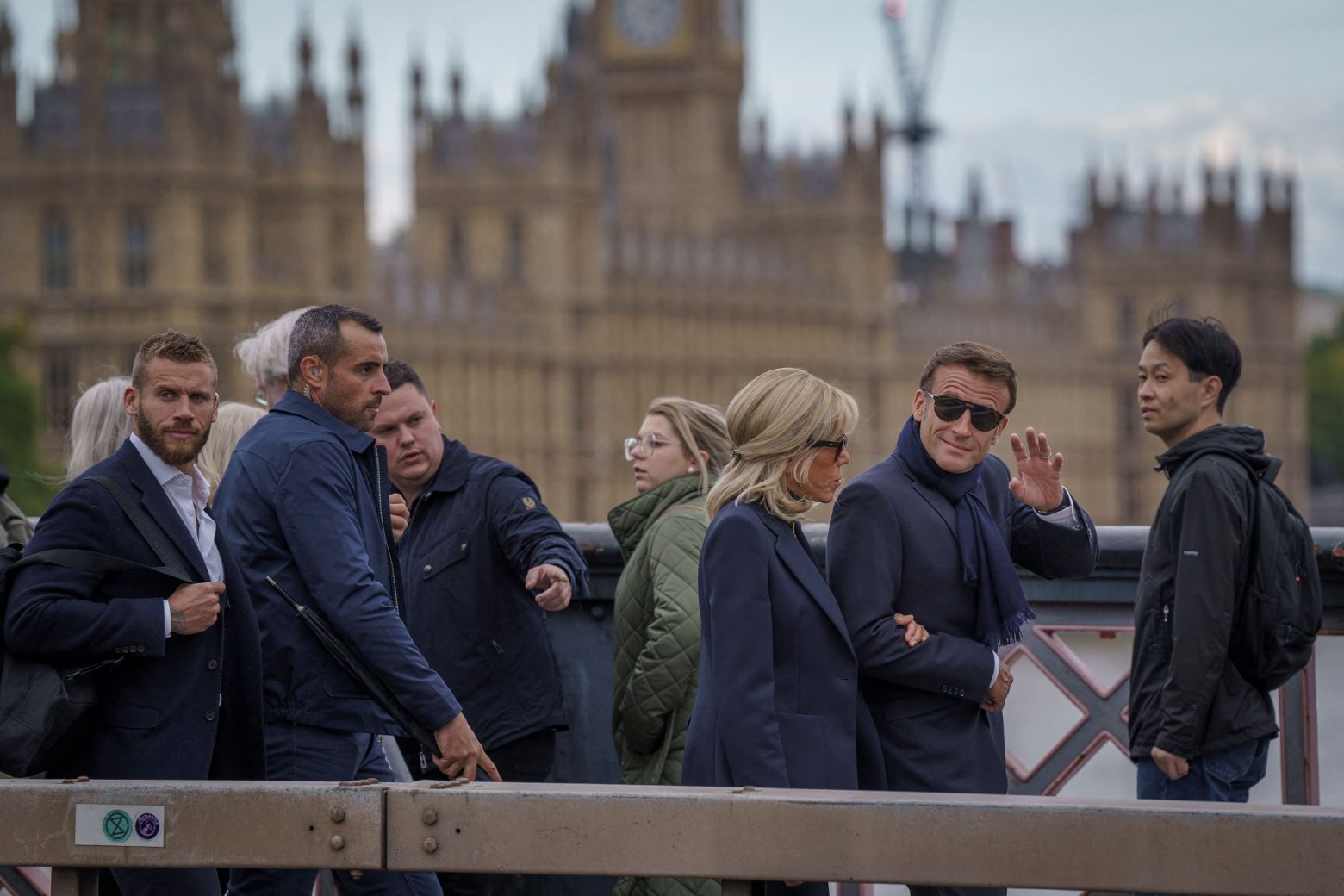 Ο πρόεδρος της Γαλλίας έφτασε στο κέντρο του Λονδίνου με γυαλιά ηλίου και κασκόλ, φορώντας σκούρο κοστούμι.