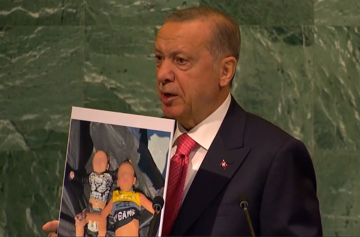 Εφ' όλης της ύλης επίθεση κατά της Ελλάδας εξαπέλυσε ο τούρκος πρόεδρος από τη βήμα του ΟΗΕ - Παρουσίασε φωτογραφία προσφυγόπουλου το οποίο βρήκε τραγικό θάνατο