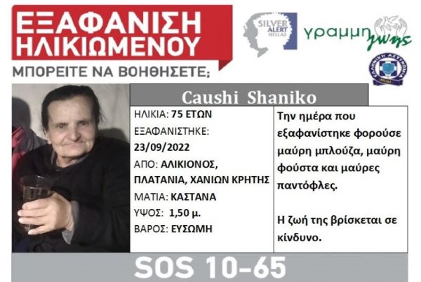 Ειδικότερα, η 75χρονη Caushi Shaniko, εξαφανίστηκε από το σπίτι της, στον Αλικιανό, στην περιοχή του Πλατάνια Χανίων Κρήτης, όταν έφυγε για να επισκεφθεί το γιο της και δεν έφτασε ποτέ. Έχει καστανά μάτια, ύψος 1,50μ και είναι εύσωμη.