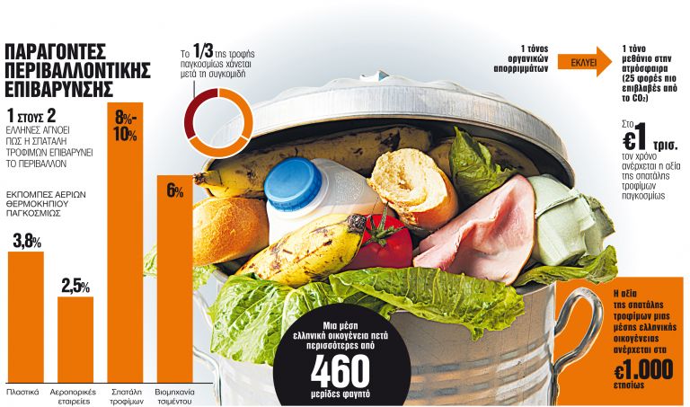 Ταυτόχρονα, η σπατάλη τροφίμων ευθύνεται για το 10% των παγκόσμιων εκπομπών αερίων του θερμοκηπίου, ενώ ένας τόνος οργανικών απορριμμάτων εκλύει περίπου έναν τόνο μεθάνιο στην ατμόσφαιρα, που είναι, βάσει των επιστημονικών μελετών, 25 φορές πιο επιβλαβές από το CO2.