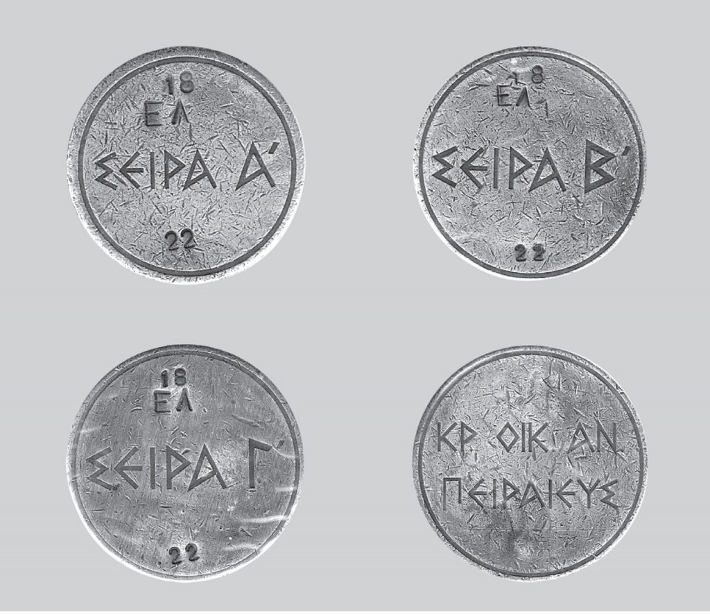 Τυχαία εντόπισα μάρκες των Βούρλων. Βρήκα έναν κύριο που ο πατέρας του ήταν στα Βούρλα χωροφύλακας. Γύρναγα τότε τα πειραϊκά καφενεία να βρω παλιούς και μου λέει αυτός: «Ρε φίλε, έχω κάτι σαν κέρματα». Και ήταν μάρκες από τα Βούρλα. Εχουν και επισήμανση γνησιότητας πάνω, για να μην κλέβουν οι μαντάμες.