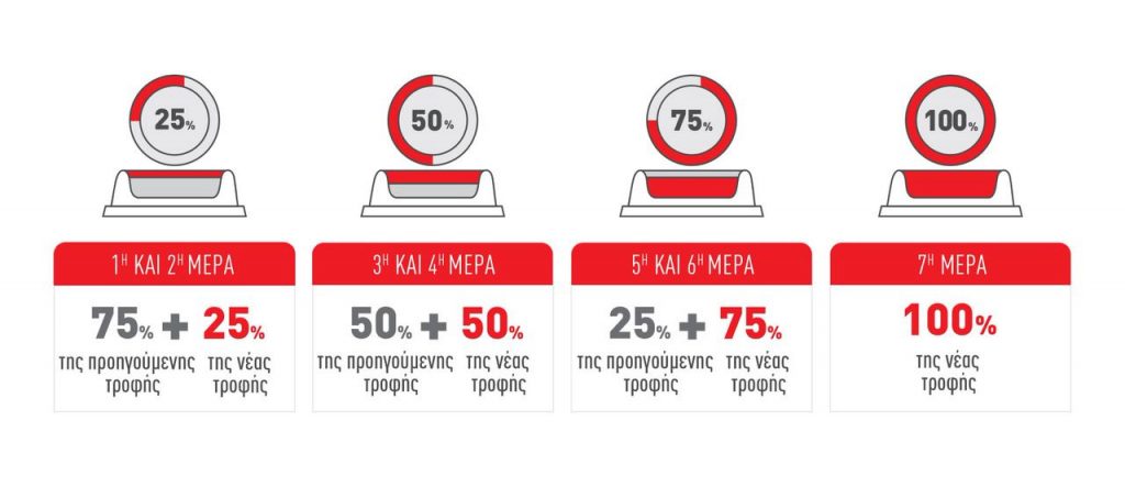 Για να μην είναι απότομη η μετάβαση στην τροφή, τόσο για το σκύλο σας, όσο και για το πεπτικό του σύστημα, δεν πρέπει να προσπαθήσετε να του δώσετε αμέσως τη νέα τροφή. Η σωστή μέθοδος είναι να εντάσσετε τη νέα τροφή σταδιακά στα γεύματα του σκύλου σας. Ξεκινήστε να βάζετε ¼ από την καινούργια τροφή και ¾ από την παλιά. Ανεβάστε το ποσοστό της νέας τροφής σταδιακά, μέχρι να φτάσετε το 100% της νέας τροφής.