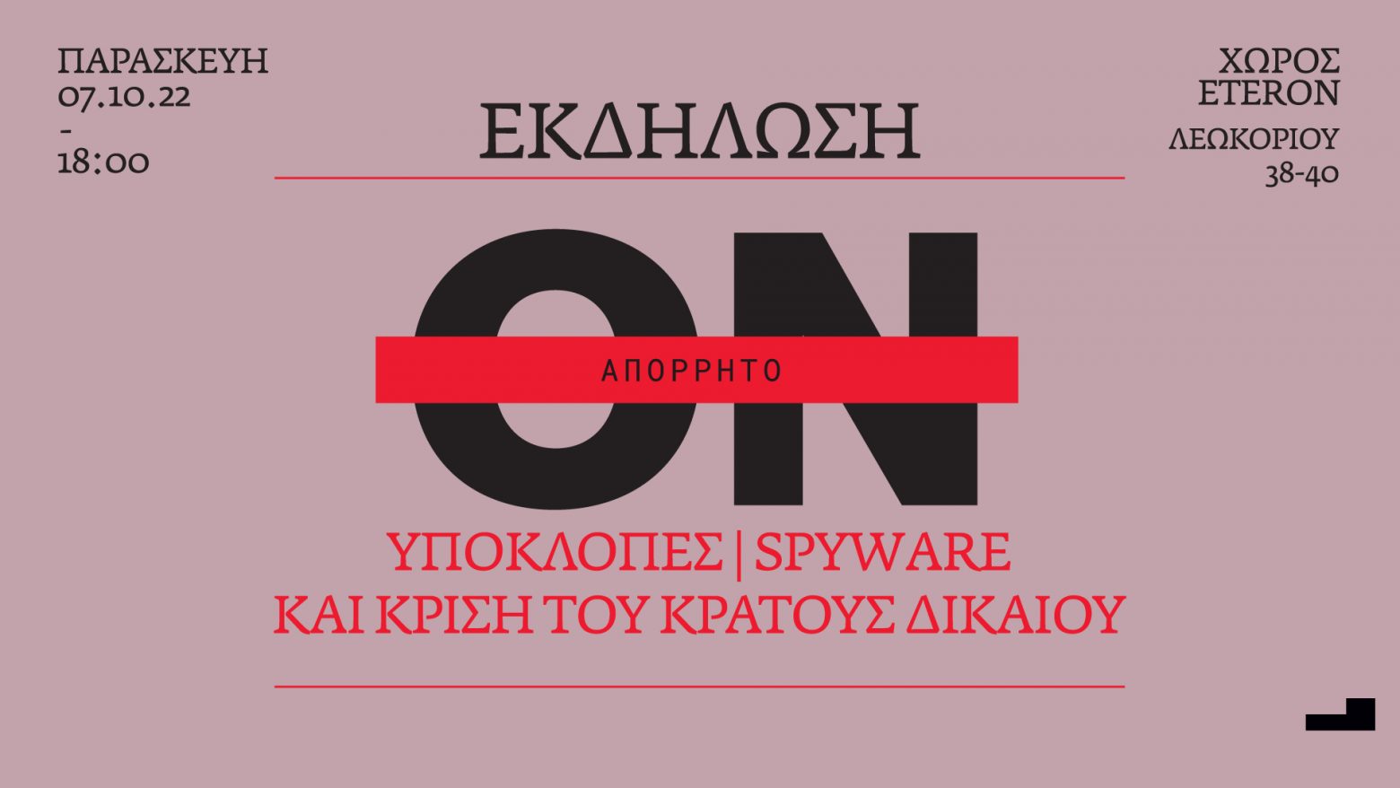 Το Eteron – Ινστιτούτο για την Έρευνα και την Κοινωνική Αλλαγή διοργανώνει εκδήλωση στον χώρο του (Λεωκορίου 38-40, Ψυρρή, Αθήνα) την Παρασκευή 7 Οκτωβρίου στις 18:00, με θέμα «Υποκλοπές | Spyware και Κρίση του Κράτους Δικαίου».