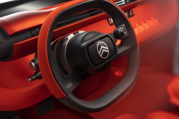 Στο λιτό ταμπλό παρεπιδημεί μόνο ένα σετ από φυσικούς διακόπτες και ένα infotainment το οποίο είναι σχεδιασμένο για να λειτουργεί συνδυαστικά με το smartphone του οδηγού. Την εικόνα συμπληρώνουν δύο αποσπώμενα ηχεία με Bluetooth στα άκρα του ταμπλό ενώ για λόγους προσβασιμότητας, οι πίσω πόρτες είναι αντίστροφα ανοιγόμενες.