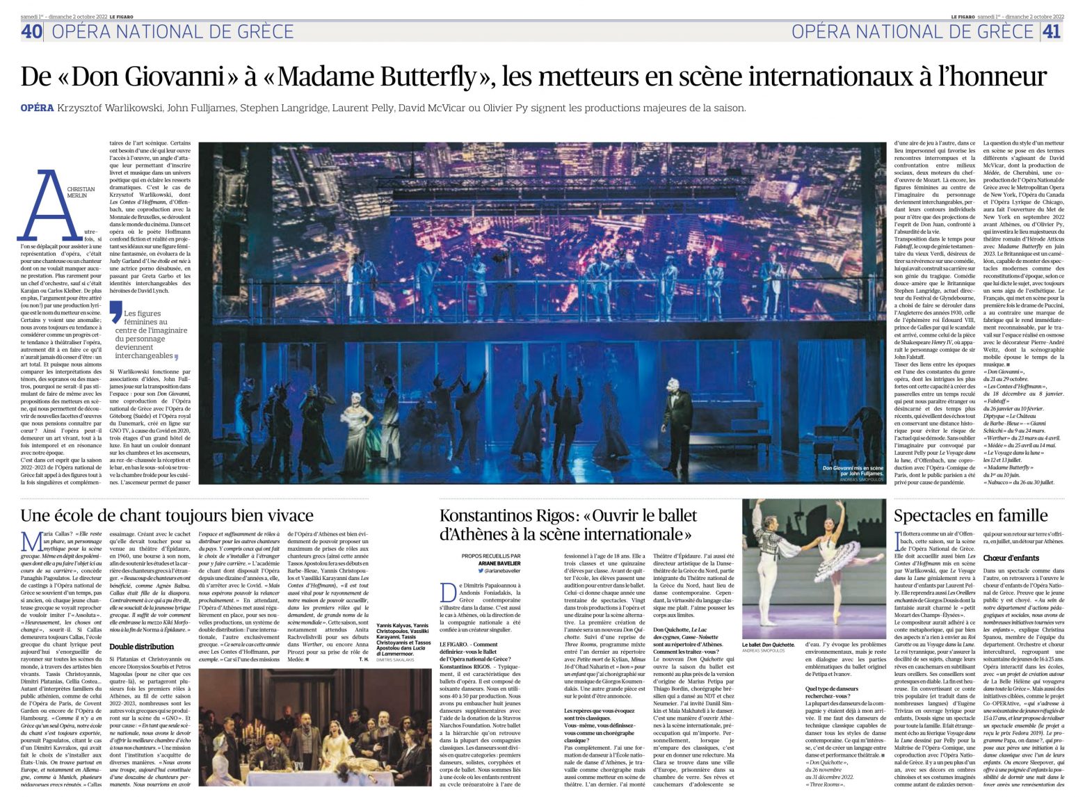 Με ένα τετρασέλιδο αφιέρωμα στην Εθνική Λυρική Σκηνή κυκλοφόρησε η κορυφαία γαλλική εφημερίδα Le Figaro το Σαββατοκύριακο 1-2 Οκτωβρίου. Οι διακεκριμένοι πολιτιστικοί συντάκτες της μουσικής και του χορού Thierry Hillériteau και Ariane Bavelier, καθώς και ο κριτικός μουσικής της εφημερίδας Christian Merlin, αναφέρονται με θερμά λόγια, στο πολυσέλιδο ρεπορτάζ, στην πολιτική των αναθέσεων νέων έργων, στο νέο πρόγραμμα της σεζόν 2022/23, στις διεθνείς συνεργασίες με σημαντικούς σκηνοθέτες και κορυφαία λυρικά θέατρα Ευρώπης και Αμερικής, στην παράδοση των Ελλήνων τραγουδιστών της όπερας που διαπρέπουν εντός και εκτός Ελλάδας, στο μπαλέτο και στα εκπαιδευτικά και κοινωνικά προγράμματα της ΕΛΣ.