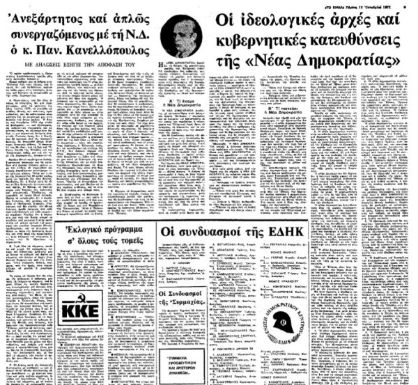 Πριν από 48 ολόκληρα χρόνια, στις 4 Οκτωβρίου 1974, δημοσιοποιήθηκε η ιδρυτική διακήρυξη της Νέας Δημοκρατίας, του κόμματος που επέπρωτο να αναδείξει κατά τη διάρκεια των μεταπολιτευτικών χρόνων επτά πρωθυπουργούς (Κωνσταντίνο Καραμανλή, Γεώργιο Ράλλη, Τζαννή Τζαννετάκη, Κωνσταντίνο Μητσοτάκη, Κώστα Καραμανλή, Αντώνη Σαμαρά και Κυριάκο Μητσοτάκη) και να διαμορφώσει σε καθοριστικό βαθμό το ελληνικό πολιτικό σκηνικό επί μισό σχεδόν αιώνα.