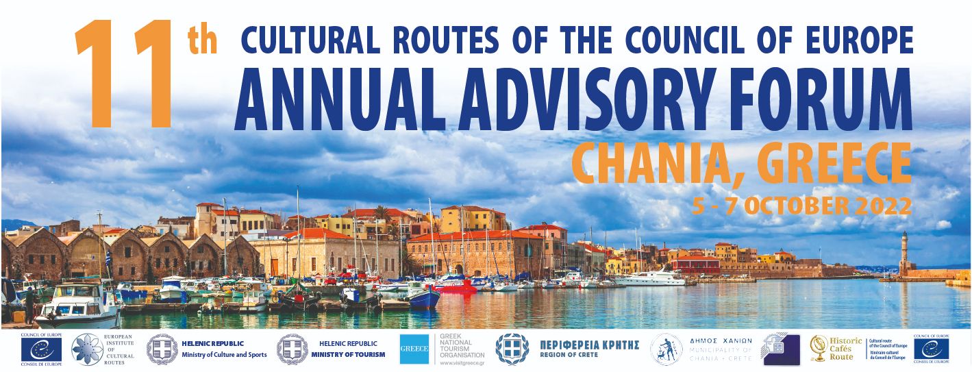 Η Διευρυμένη Μερική Συμφωνία Πολιτιστικών Διαδρομών του Συμβουλίου της Ευρώπης και το Ευρωπαϊκό Ινστιτούτο Πολιτιστικών Διαδρομών, σε συνεργασία με το Υπουργείο Πολιτισμού και Αθλητισμού, το Υπουργείο Τουρισμού, τον ΕΟΤ, την Περιφέρεια Κρήτης, τον Δήμο Χανίων, το Εμπορικό και Βιομηχανικό Επιμελητήριο Χανίων, καθώς και την Πολιτιστική Διαδρομή «Δρόμος των Ιστορικών Καφέ», ανακοινώσουν την έναρξη του 11ο Ετήσιου Συμβουλευτικού Forum Πολιτιστικών Διαδρομών του Συμβουλίου της Ευρώπης, που θα πραγματοποιηθεί από 5 έως 7 Οκτωβρίου 2022 στα Χανιά.