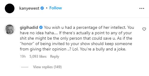 Αμέτοχη όμως, δεν έμεινε ούτε η Τζίτζι Χαντίντ. Το γνωστό μοντέλο έγραψε κάτω από την ανάρτησητου Κάνιε:
