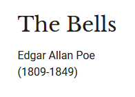 «Σαν πέθανε η Βιργινία ο Έντγκαρ άρχισε να πίνη πολύ. Ξαναγύρισε στη Βαλτιμόρη. Τότε έγραψε τους περίφημους στίχους των «Σημάντρων». Μια νύχτα, λέει η παράδοση, ο Έντγκαρ είχε πάει στη δημόσια βιβλιοθήκη. Γύριζε αργά στο σπίτι του, χιόνιζε. Άκουσε τα κουδούνια μιας καρότσας. Ήταν μια χαρωπή μελωδία. Χύθηκε η μελωδία στην καρδιά του. Έψαξε στην τσέπη του γυρεύοντας μολύβι και χαρτί. Δεν είχε. Τα μαγαζιά είχαν κλείσει. Οι στίχοι έρχονταν ο ένας πίσω απ’ τον άλλον – φράσεις εξαίσιες θα χάνονταν. Ο Πόε χίμησε στο πρώτο σπίτι που ήταν εκεί κοντά, χτύπησε το κουδούνι. Ήταν το σπίτι του δικαστή Ζιλ. Άνοιξε ο ίδιος ο δικαστής. «Χαρτί και μελάνη σάς παρακαλώ!» είπε έξαλλος ο νυχτερινός ξένος. Ο δικαστής, βλέποντας πως είχε να κάμη μ’ έναν κύριο, τον κάλεσε μέσα, τον οδήγησε στη βιβλιοθήκη του κι αποσύρθηκε ευγενικά αφήνοντας μόνο του τον ξένο. Όταν αργότερα μπήκε στη βιβλιοθήκη για να δη τι κάνει ο άγνωστος, αυτός δεν ήταν πια εκεί. Είχε φύγει. Όμως πάνω στο τραπέζι, γραμμένες σ’ ένα χαρτί, ήταν οι πρώτες τρεις στροφές των «Σημάντρων», που αργότερα ο δικαστής τις κορνίζωσε και τις κρέμασε στο γραφείο του».