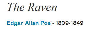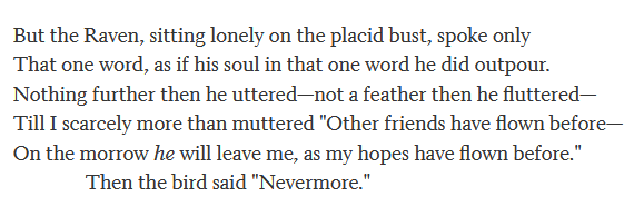 «Τότε, στα 1846, ήρθε με τη νέα γυναίκα του, τη Βιργινία, εδώ, στην καλύβα αυτή εδώ του Φόρνταμ. Λίγο νωρίτερα είχε αρχίσει να γράφη το «Κοράκι», το αθάνατο παράπονο του «Nevermore». Το υπέγραψε με ψευδώνυμο. Ωστόσο τον έμαθαν. Έγινε ένδοξος.