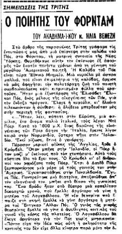 *Άρθρο του λογοτέχνη και ακαδημαϊκού Ηλία Βενέζη, που έφερε τον τίτλο «Ο ποιητής του Φόρνταμ» και είχε δημοσιευτεί στην εφημερίδα «Το Βήμα» στις 15 Δεκεμβρίου 1959.