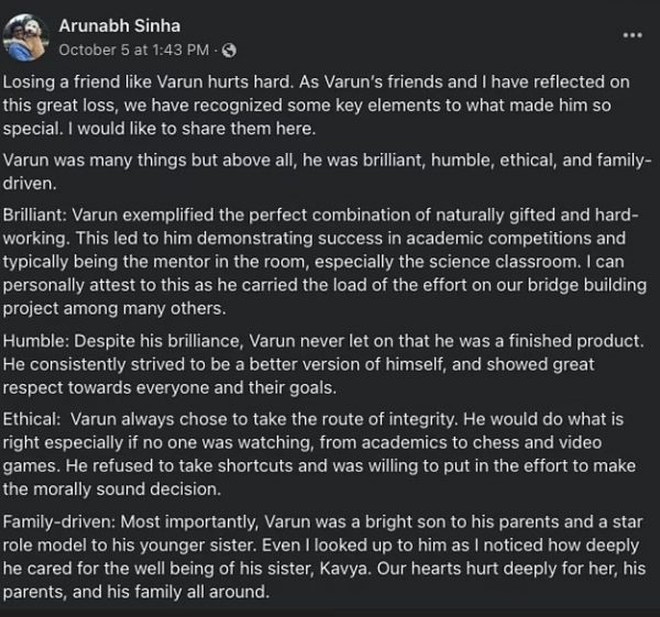«Ήταν προορισμένος να έχει μεγάλο αντίκτυπο στον κόσμο μας και ενώ μας στέρησαν αυτή την ευκαιρία, εξακολουθώ να εκτιμώ ιδιαίτερα το γεγονός ότι τον γνώριζα από την 1η δημοτικού. Αναπαύσου εν ειρήνη, Varun. Θα μας λείψεις πολύ».