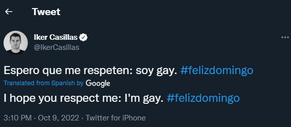«Φωτιά» έβαλε στο twitter έβαλε το μεσημέρι της Κυριακής ο Ίκερ Κασίγιας, με ανάρτηση στον προσωπικό του λογαριασμό, μέσω της οποίας δηλώνει ότι είναι gay.