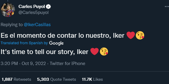 Από εκεί και πέρα, ένας από τους πρώτους που σχολίασαν στην ανάρτηση του ήταν ο συμπαίκτης του στην εθνική Ισπανίας, Κάρλες Πουγιόλ, ο οποίος έγραψε χιουμοριστικά πως ήρθε η ώρα να αποκαλύψει την ιστορία τους.
