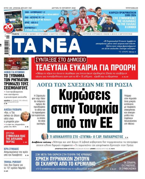 Στα «ΝΕΑ» της Δευτέρας: Κυρώσεις στην Τουρκία από την ΕΕ