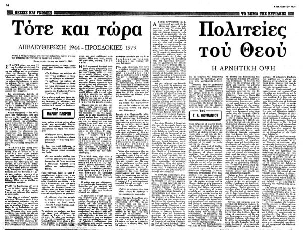 *Αποσπάσματα από κείμενο του Μάριου Πλωρίτη, που έφερε τον τίτλο «Τότε και τώρα» και τον υπότιτλο «Απελευθέρωση 1944 – Προσδοκίες 1979», είχε δε δημοσιευτεί στην εφημερίδα «Το Βήμα της Κυριακής» στις 7 Οκτωβρίου 1979.