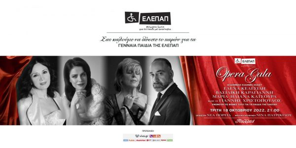 Μεγάλο φιλανθρωπικό γεγονός στο Θέατρο Παλλάς. Διεθνείς Έλληνες σολίστ, που έχουν διαγράψει λαμπρή καριέρα στην Ελλάδα και το εξωτερικό, ενώνουν τις φωνές τους με αυτές των Γενναίων Παιδιών της ΕΛΕΠΑΠ, στηρίζοντας έμπρακτα τον καθημερινό τους αγώνα για ένα καλύτερο μέλλον, σε ένα μοναδικό Opera Gala στο θέατρο Παλλάς, στις 18 Οκτωβρίου 2022 και ώρα 21:00.