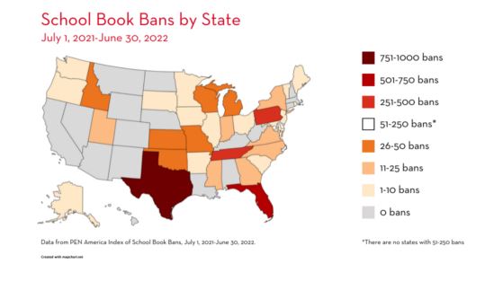 Οι πολιτείες με τα περισσότερα περιστατικά απαγόρευσης βιβλίων είναι το Τέξας, η Φλόριντα, η Πενσυλβάνια και το Τενεσί -οι μοναδικές της λίστας με τριψήφιους αριθμούς. Με εξαίρεση την τρίτη, οι υπόλοιπες της τετράδας έχουν σκληροπυρηνικούς -τραμπικής γραμμής- Ρεπουμπλικανούς κυβερνήτες.