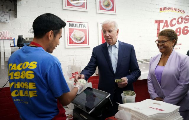 Ο πρόεδρος των ΗΠΑ Τζο Μπάιντεν έδωσε χθες Πέμπτη τα τετραπλάσια από ό,τι έκαναν τα τάκος που παρήγγειλε σε εστιατόριο κατά τη διάρκεια επίσκεψής του στο Λος Αντζελες, σε ένδειξη αλληλεγγύης προς τους Αμερικανούς που πλήττονται από τον πληθωρισμό, τρεις εβδομάδες πριν τις ενδιάμεσες εκλογές (φωτογραφία, επάνω, από Kevin Lamarque/Reuters).