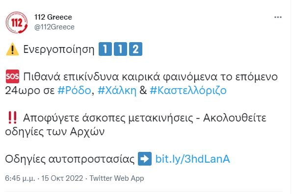 Νέο μήνυμα του 112 σε Ρόδο, Χάλκη και Καστελόριζο εστάλη λίγο πριν τις 19:00 του Σαββάτου, τη στιγμή που η Κρήτη μετράει τις πληγές της από το πέρασμα της φονικής κακοκαιρίας.