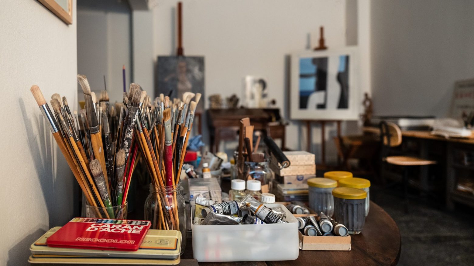 Το ατελιέ του, τα πινέλα του, οι παλέτες του