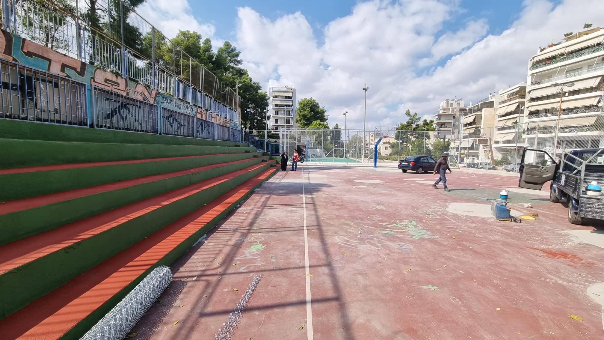 Συγκεκριμένα, οι εργασίες πραγματοποιούνται στα γήπεδα καλαθοσφαίρισης της Ευαγγελίστριας επί της λεωφόρου Εθνικής Αντιστάσεως στην Καλογρέζα που υπέστησαν ολική καταστροφή από ανεμοστρόβιλο και στο γήπεδο ποδοσφαίρου 5×5 στην οδό Δεμιρδεσίου στον Περισσό.