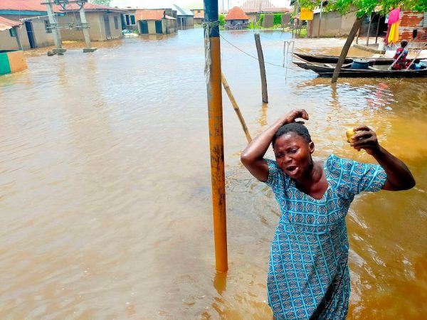Μια γυναίκα κραυγάζει σε πλημμυρισμένο δρόμο στην πολιτεία Ανάμπρα (φωτογραφία AP)