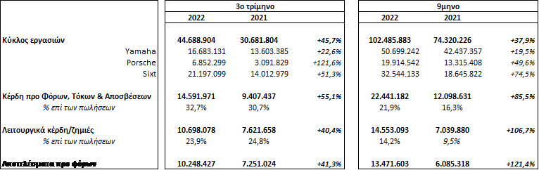 Οι πωλήσεις δικύκλων & προϊόντων θάλασσας (Yamaha) διατήρησαν την θετική τους πορεία, αν και τα προβλήματα στην εφοδιαστική αλυσίδα επιμένουν, παρουσιάζοντας αύξηση 19,5% στα 50,7 εκ. ευρώ. Ακόμα πιο θετική εξέλιξη για τις πωλήσεις αυτοκινήτων (Porsche) που ανέρχονται στα 19,9 εκ. ευρώ, παρουσιάζοντας αύξηση 49,6% σε μια συνολική αγορά αυτοκινήτου στην Ελλάδα που παρουσίασε μόλις οριακή αύξηση στο ενιάμηνο του 2022.