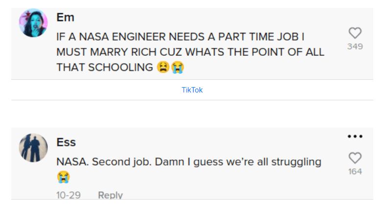 Ένα άλλο άτομο παραπονέθηκε: «Δηλαδή ούτε η NASA δεν πληρώνει τόσο καλά;». Κάποιος πρόσθεσε: «Αν κάποιος στη NASA χρειάζεται μια δεύτερη δουλειά, δεν έχω καμία ελπίδα για το μέλλον μου». Κάποιος άλλος έγραψε: «Ξέρω ότι όλοι σας νομίζετε ότι η NASA είναι γ@μάτη, αλλά είναι μια κυβερνητική δουλειά όπως και πολλές άλλες που δεν πληρώνουν αστρονομικά».