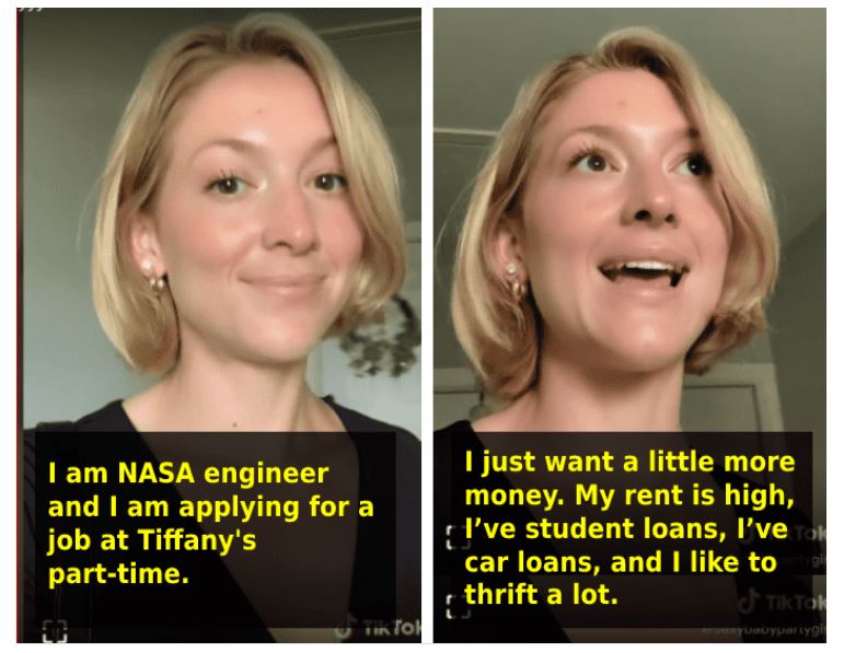 Μια περίπτωση γυναίκας μηχανικού της NASA που αναζητά δεύτερη δουλειά για να ανταπεξέλθει στα έξοδα διαβίωσης έχει προκαλέσει αίσθηση. Η Kelly, η οποία ακούει στο όνομα @sexybabypartygirl στο TikTok, δημοσίευσε ένα βίντεο που δείχνει τον εαυτό της να προετοιμάζεται για μια συνέντευξη για δεύτερη δουλειά και προκάλεσε συζήτηση σχετικά με το κόστος διαβίωσης και τους μισθούς των εργαζομένων σε φημισμένες εταιρείες. Η Kelly έχει πτυχίο χημικού μηχανικού και εργάζεται στη NASA, ανέφερε η DailyDot. Ανέβασε επίσης ένα βίντεο με τον εαυτό της να χορεύει κατά τη διάρκεια του μεσημεριανού της διαλείμματος φορώντας τα ρούχα εργασίας της NASA.