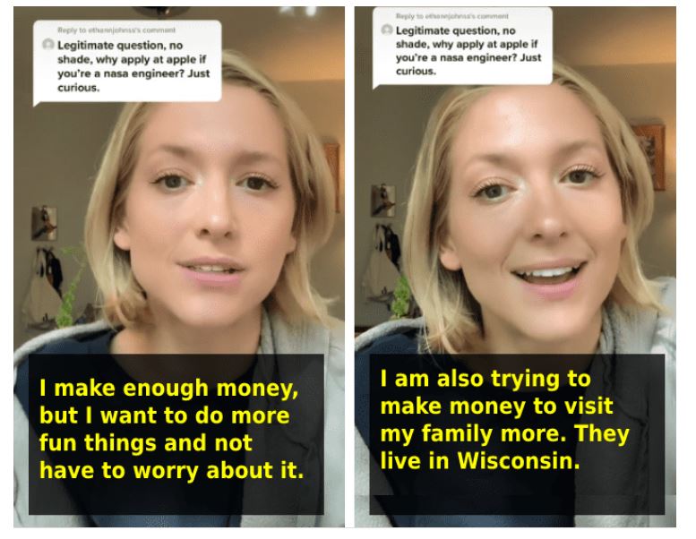 Η ίδια απάντησε στα σχόλια, γράφοντας: «Μου αρέσει η δουλειά μου στη NASA, πληρωνόμαστε καλά. Απλά θέλω λίγα περισσότερα χρήματα, δεν ψάχνω για νέα δουλειά πλήρους απασχόλησης, αλλά το ενοίκιο μου είναι υψηλό, έχω φοιτητικά δάνεια, έχω δάνεια αυτοκινήτου και μου αρέσει να κάνω οικονομία».