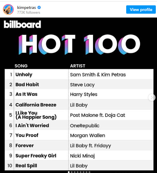 Το «Unholy» του Sam Smith και της Kim Petras ανεβαίνει στην κορυφή του Billboard Hot 100, χαρίζοντας και στους δύο καλλιτέχνες το πρώτο τους No. 1 στο chart.