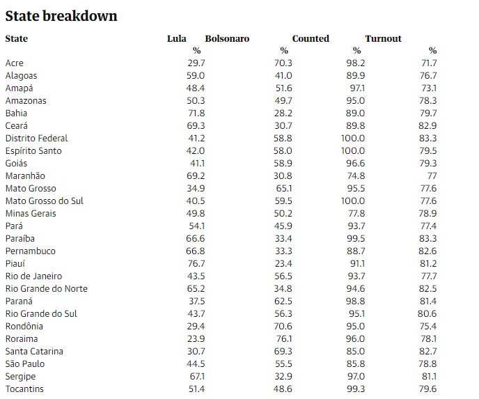 Επειδή οι μεγαλύτεροι δήμοι είναι συχνά οι τελευταίοι από τους οποίους βγαίνουν επίσημα στοιχεία, τα πρώιμα αποτελέσματα μπορεί να είναι παραπλανητικά. Στον πρώτο γύρο, η υποστήριξη του Λούλα ήταν ισχυρότερη στο βόρειο και το ανατολικό τμήμα της χώρας και του Μπολσονάρο στο νότο. Η πολιτεία Μίνας Ζεράις θεωρείται συχνά από τις πιο κρίσιμες.