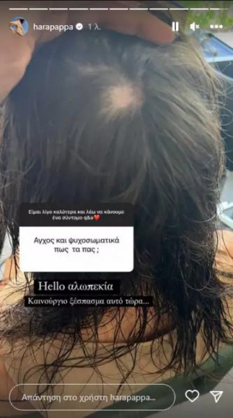 Σε μια αποκάλυψη που ξάφνιασε τους followers της, προχώρησε η Χαρά Παππά. Το μοντέλο, που γνωρίσαμε μέσα από το GNTM, έκανε γνωστό πως πάσχει από αλωπεκία και έδειξε μάλιστα φωτογραφία με το σημείο του κεφαλιού της, όπου και ξεκίνησε η τριχόπτωση.