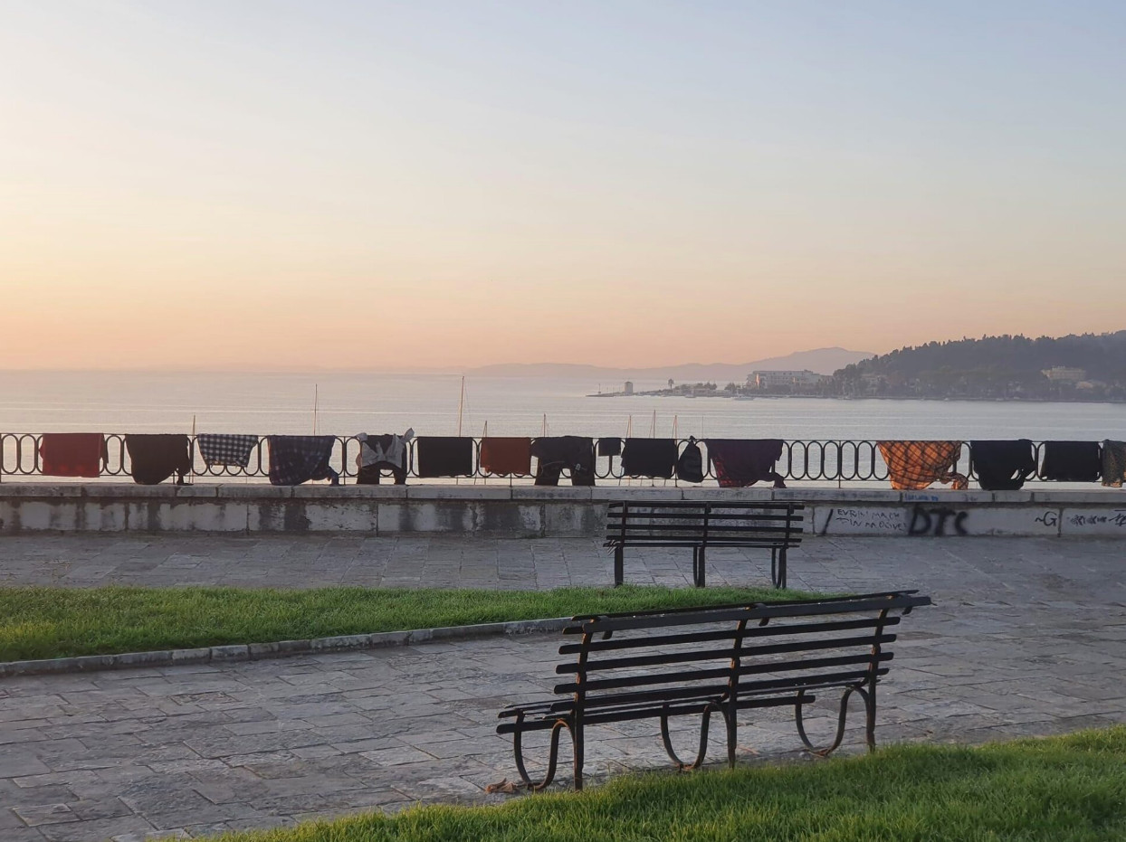 Ο «αθεόφοβος» τοποθέτησε τα ρούχα του κατά μήκος του τείχους πάνω από το Ναυτικό Αθλητικό Όμιλο Κέρκυρας, με φόντο το Παλαιό Φρούριο, το απέραντο γαλάζιο και το ηλιοβασίλεμα.