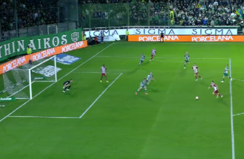 Στη συνέχεια, ο ακραίος αμυντικός των Ερυθρόλευκων επιχείρησε το γύρισμα προς την περιοχή, όπου εκεί περίμενε ο Πεπ Μπιέλ, με τον Ισπανό να πιάνει το σουτ, όμως η μπάλα βρήκε πάνω στον Φακούντο Σάντσες που πρόλαβε να βάλει την προβολή.