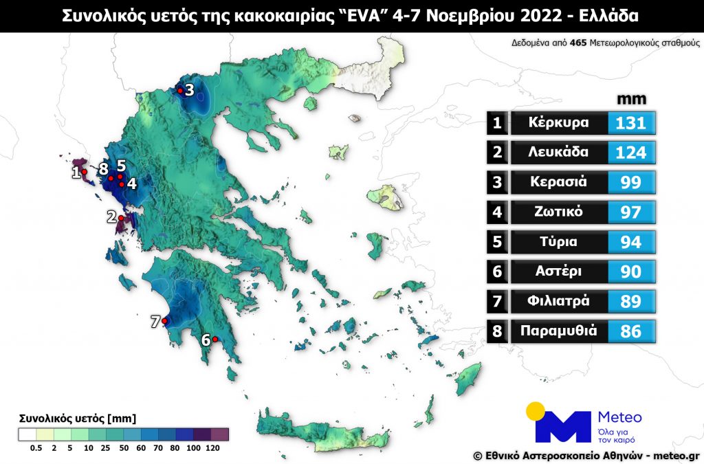 Τα στοιχεία των καταγραφών του συνολικού ύψους βροχής σε χιλιοστά στη διάρκεια των τριών ημερών 4 έως 7/11, από 465 μετεωρολογικούς σταθμούς του Εθνικού Αστεροσκοπείου Αθηνών/meteo.gr, δείχνουν ότι τα μεγαλύτερα ύψη βροχής σημειώθηκαν στην Κέρκυρα (131 χιλιοστά), στη Λευκάδα (124), στην Κερασιά Πέλλας (99), στο Ζωτικό Ιωαννίνων (97) και στα Τύρια Ιωαννίνων (94).