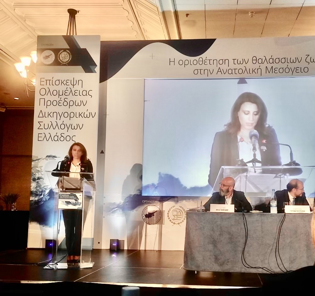 Αναφερόμενη στην Τουρκία τόνισε ότι «δεν έχει αντιμετωπίσει κυρώσεις ως διεθνής παραβάτης, βρισκόμαστε σήμερα εδώ, με εσάς να ανατέμνετε νομικά τα δικαιώματα που απορρέουν από το Διεθνές Δίκαιο για την οριοθέτηση των θαλασσίων ζωνών, αλλά κυρίως εξετάζοντας τα προσκόμματα, που προβάλλει στην εν λόγω διαδικασία το κράτος-Εισβολέας με μονομερείς ενέργειες, απειλές πολέμου και εν γένει αναθεωρητικές αξιώσεις εις βάρος δύο κυρίαρχων κρατών και κρατών-μελών της Ευρωπαϊκής Ένωσης. Της Κύπρου και της Ελλάδας.