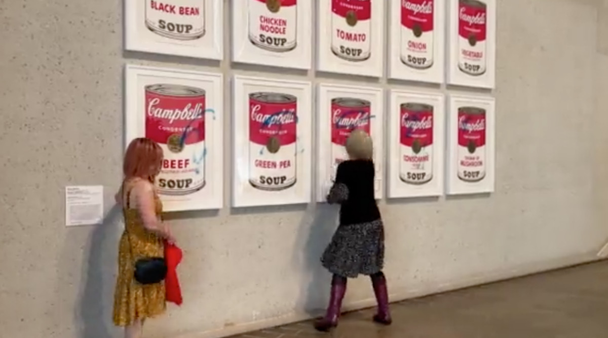 Βίντεο που δόθηκε στη δημοσιότητα έδειξε δύο γυναίκες διαδηλώτριες να χρησιμοποιούν κόλλα για να κολλήσουν τα χέρια τους στον πίνακα του Άντι Γουόρχολ «Campbell’s Soup I», που εκτίθεται στην εθνική γκαλερί της Καμπέρα.